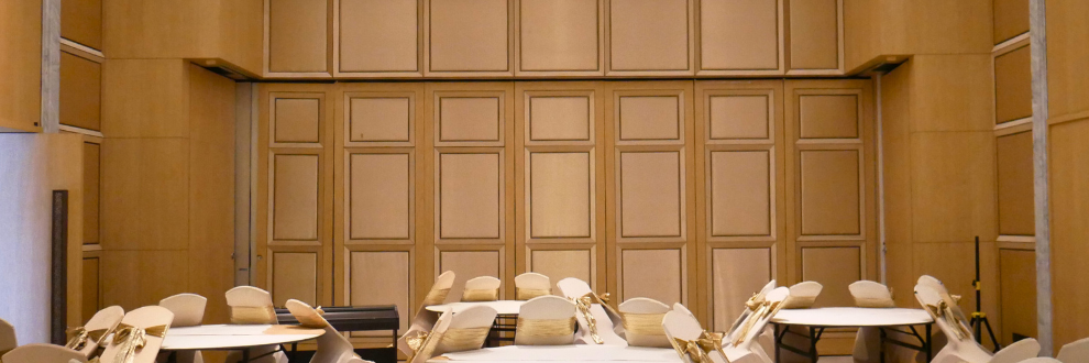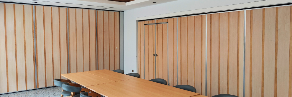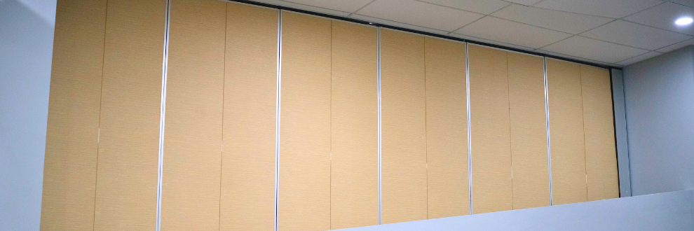 The movable partition system meets the requirements of multi-use area management, allowing the area to be used as a whole or divided. It consists of independent retractable modules that slide via carrier blocks with ball bearings along tracks that are attached to the ceiling and assembled together to form a solid wall.